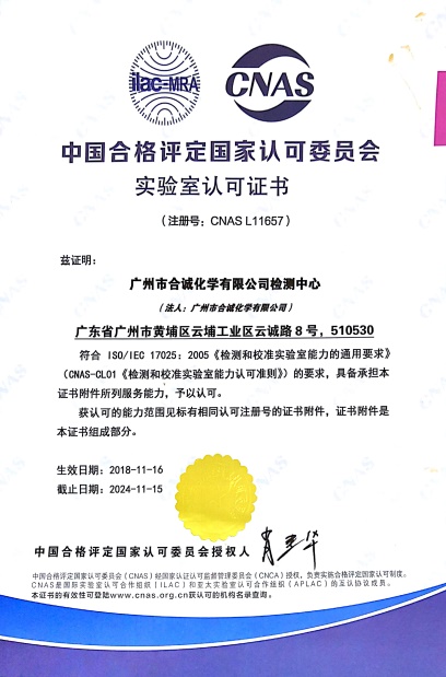 2018年11月16日,合誠技術(shù)股份有限公司旗下檢測機構(gòu)“廣州市合誠化學有限公司檢測中心”正式通過中國合格評定國家認可委員會(CNAS)的認可,取得CNAS認可證書。至此,我司中心已經(jīng)具備按照相應認可準則開展檢測服務的技術(shù)能力,技術(shù)水平和能力達到了國際標準。