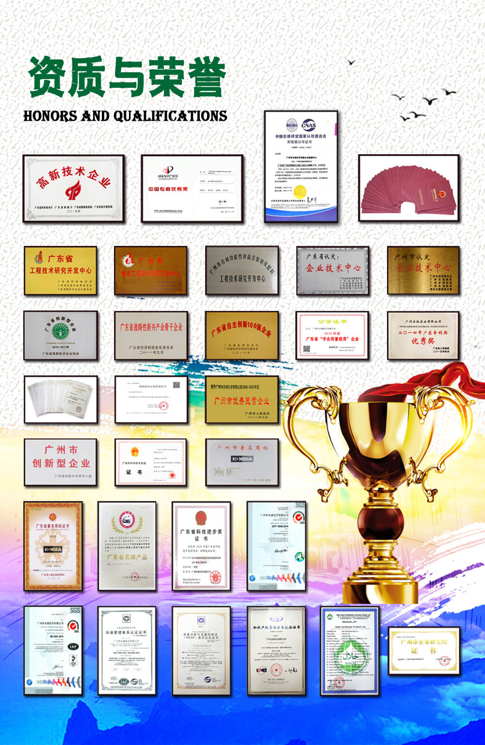 納稅信用A級榮譽證書、廣州市民營科技企業、廣州市創新型企業、廣州科學技術獎一等獎、廣州市著名商標